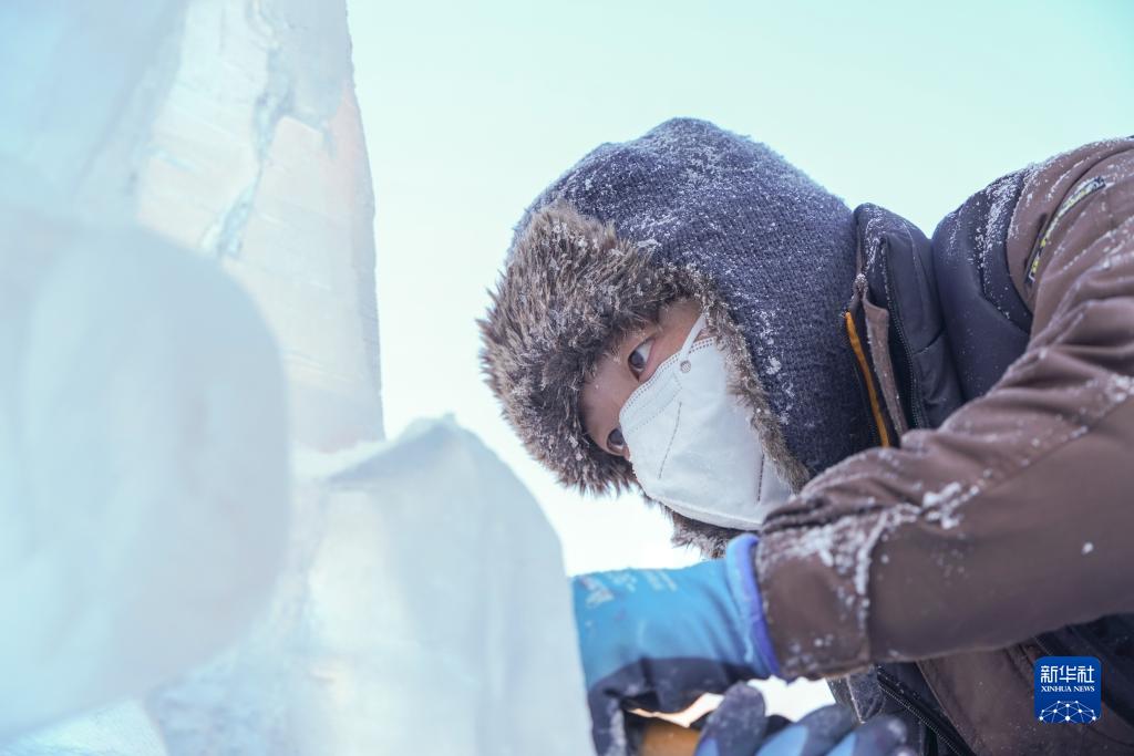 1月4日,在哈尔滨冰灯艺术游园会园区,冰雕师在进行冰雕艺术作品创作。