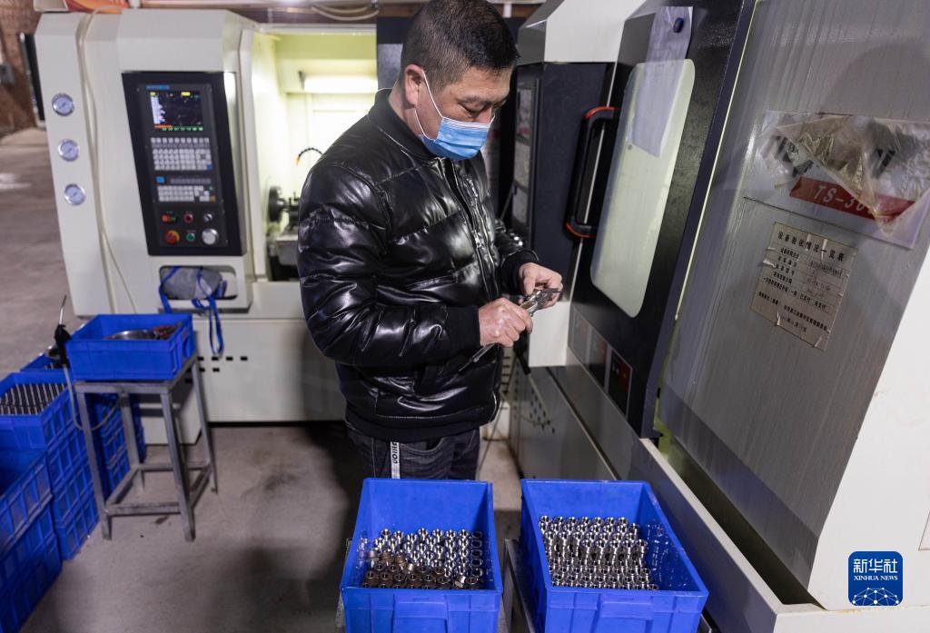1月4日,在四川省会东县小岔河特色产业园区一家汽车零部件企业的生产车间,一名在此就业的移民群众在检测液压不锈钢螺帽规格。