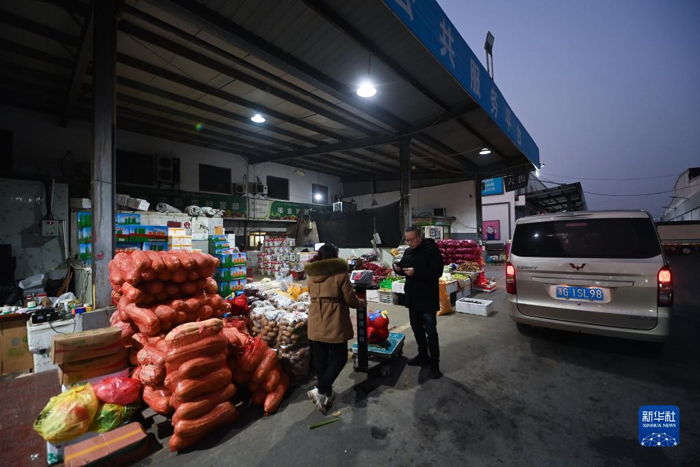 春节临近,在浙江金华农产品批发市场和水果批发市场,来自各地的蔬菜水果品种丰富、供应充足,市面购销两旺、年味十足。