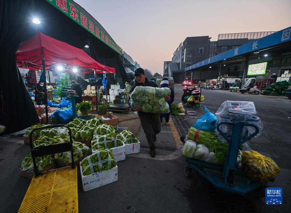 春节临近,在浙江金华农产品批发市场和水果批发市场,来自各地的蔬菜水果品种丰富、供应充足,市面购销两旺、年味十足。