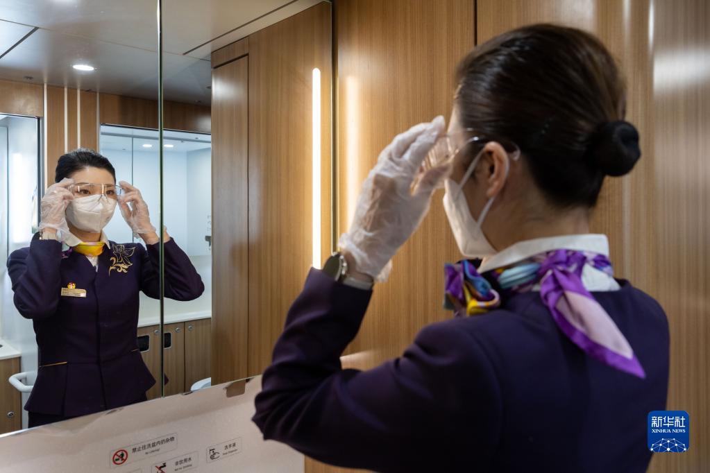 1月4日,铁路上海客运段乘务员在列车上戴护目镜。