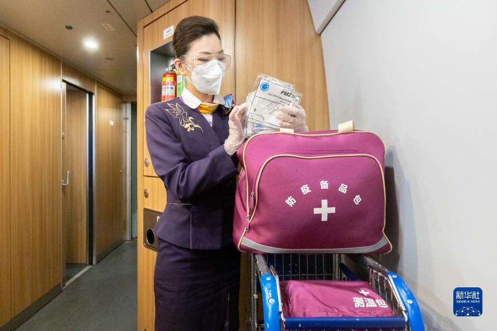 1月4日,铁路上海客运段乘务员在列车上整理防疫备品包。
