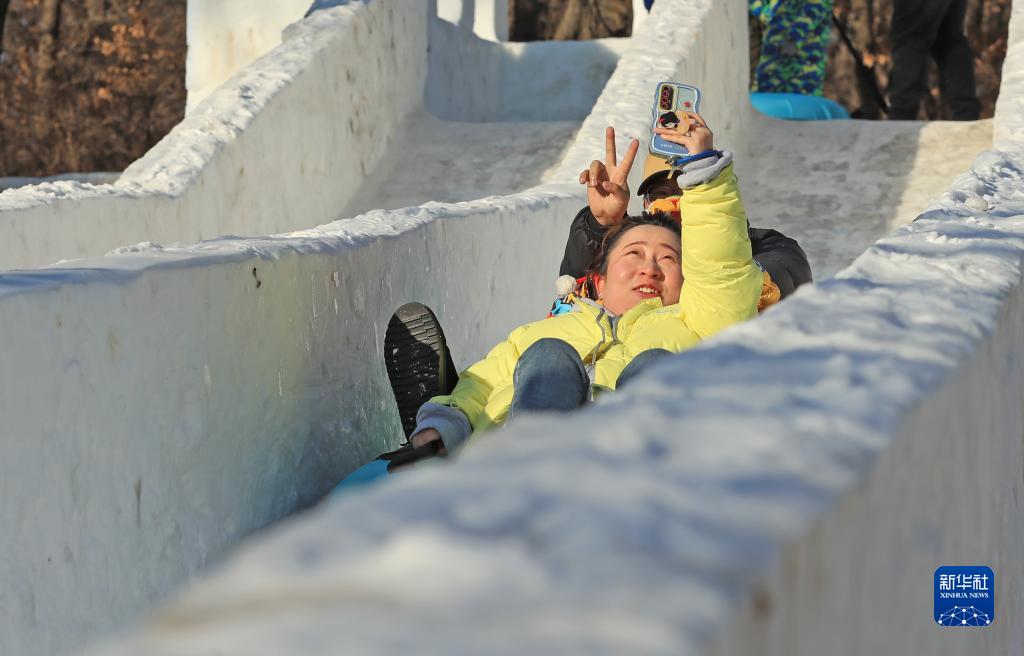 1月3日,游客在沈阳世博园体验雪圈项目。