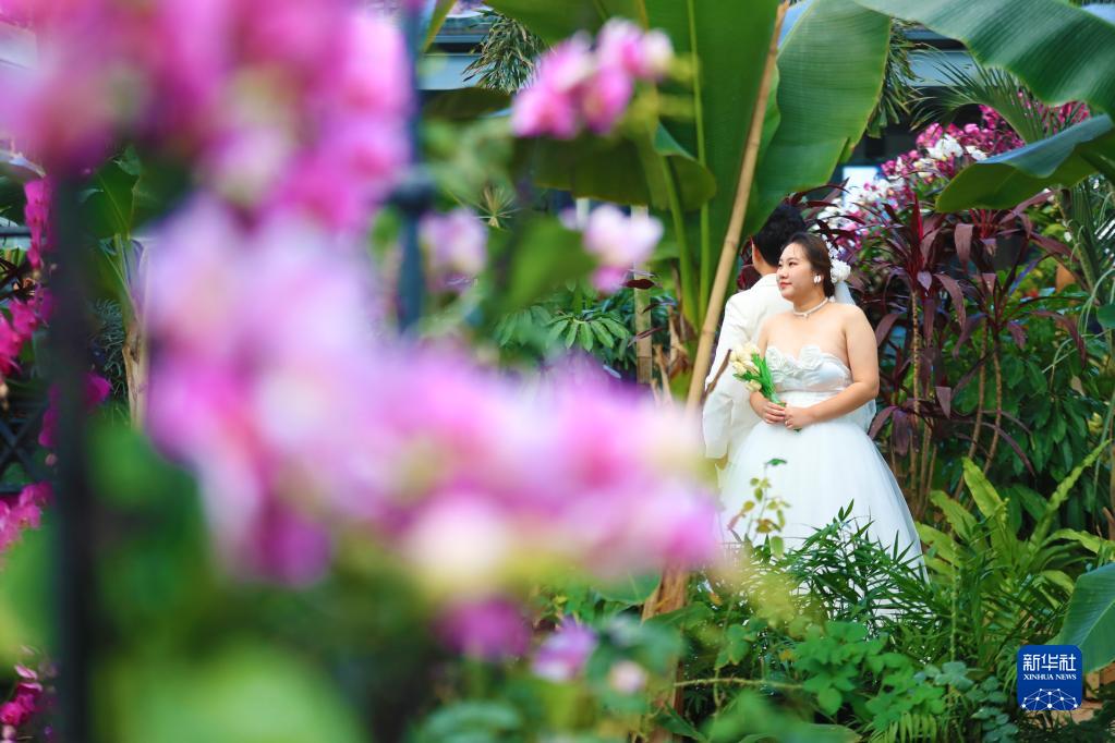 1月3日,一对情侣在沈阳世博园里的迎春花展上拍摄婚纱照。