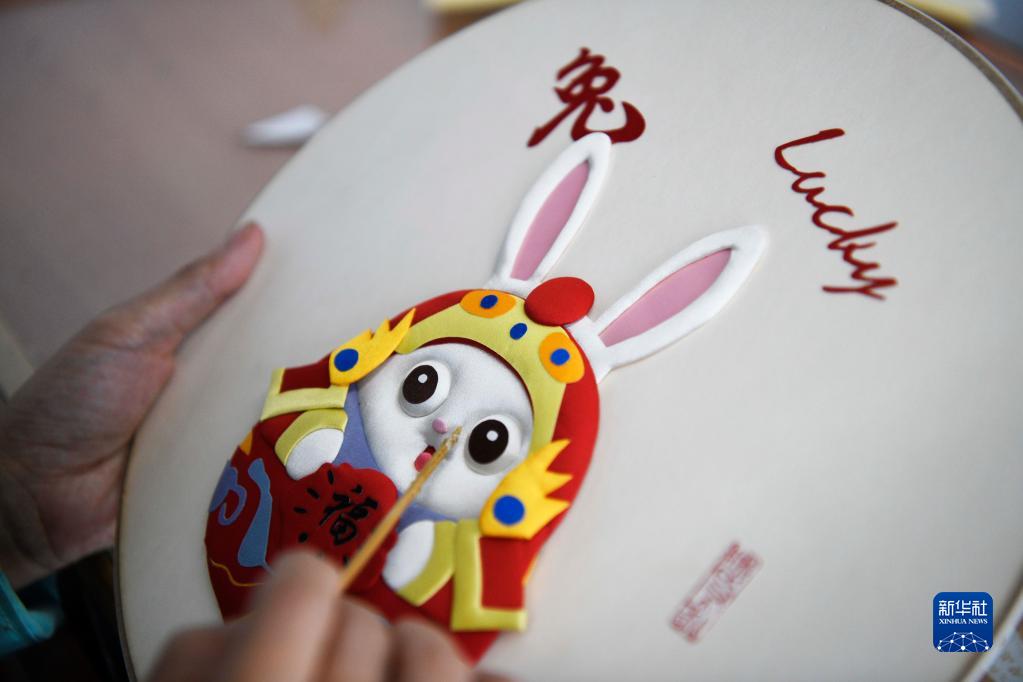 腊月里,河北省丰宁满族自治县布糊画手工艺人以兔为主题,制作憨态可掬、萌味十足的兔年主题布糊画,喜迎新春佳节。布糊画是国家级非物质文化遗产,以绫罗绸缎等面料为主,在满族传统工艺“补花”的基础上,取绘画、浮雕、堆绣、剪纸、裱糊、布贴画等传统工艺精华结为一体,呈现出浮雕立体的效果。