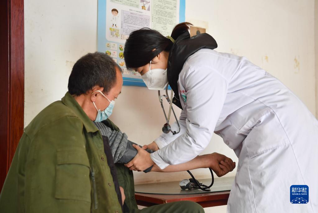 1月3日,上门问诊的医生崔思语在西安市长安区滦镇街道沣峪村村民段春成家中为其测量血压。