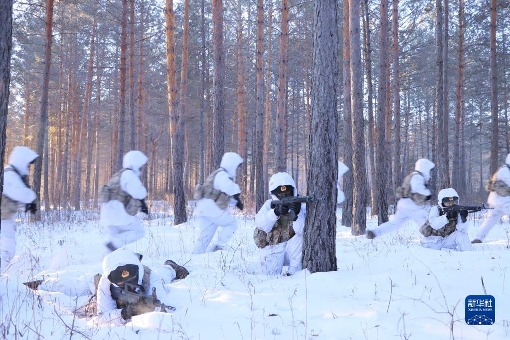 1月4日,驻守在黑龙江漠河北极村的北部战区陆军某边防旅北极哨所官兵在极寒天气下组织战术训练。