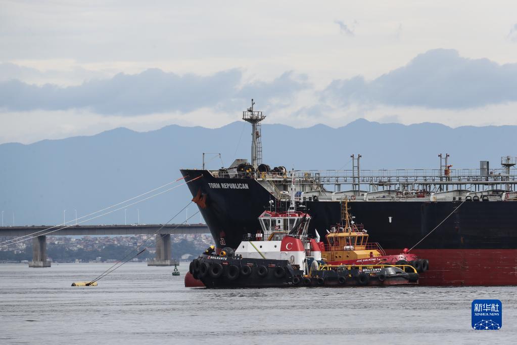 这是1月4日在巴西里约热内卢瓜纳巴拉湾拍摄的一艘集装箱货轮。