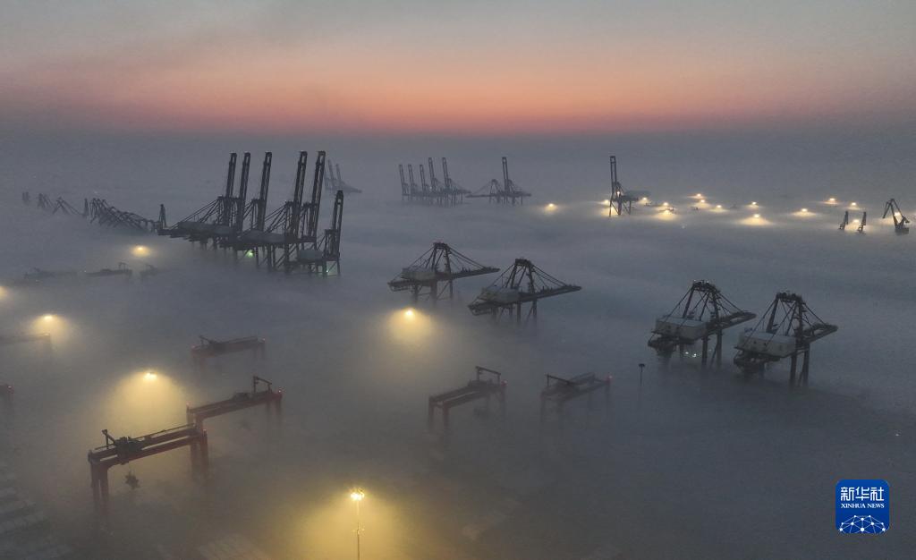 平流雾中的唐山港京唐港区景色(1月5日摄,无人机照片)。