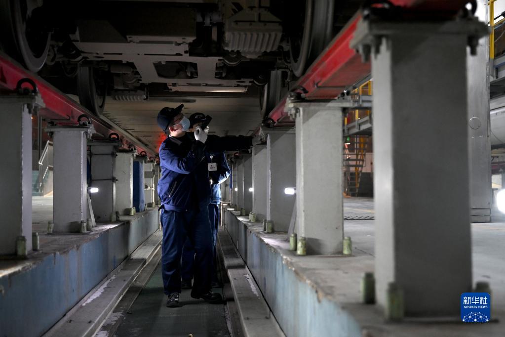 1月4日,合肥南动车运用所的工作人员对动车组列车进行检修。
