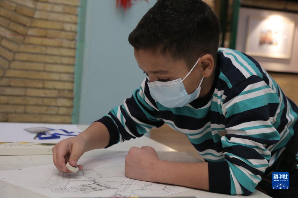 1月4日,在伊朗首都德黑兰举行的首届“印象中国——伊朗青少年绘画比赛”作品展上,一名儿童在作画。