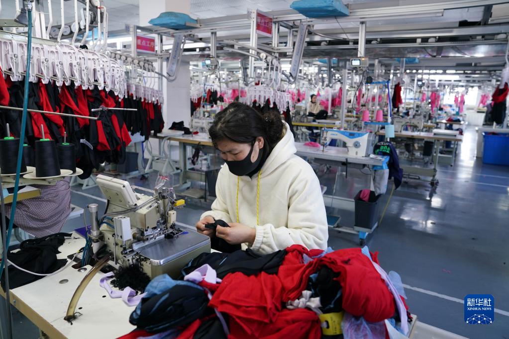 工人在位于南昌市青山湖区的南昌市众拓制衣有限公司车间内忙碌(1月4日摄)。