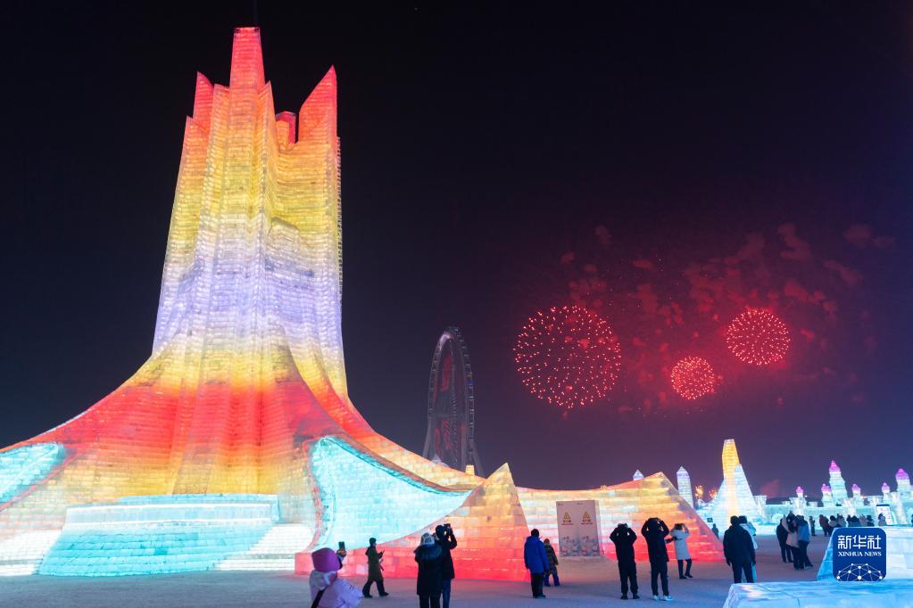 1月5日,冰雪节启幕焰火在冰雪大世界园区上空绽放。
