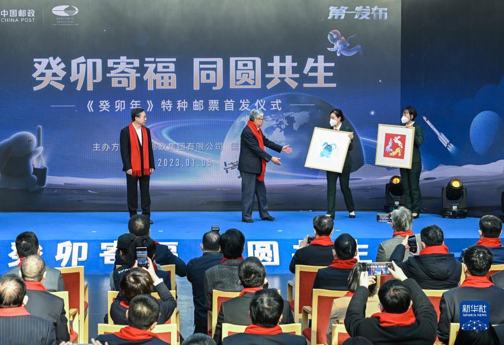 1月5日,由艺术家黄永玉绘制的邮票设计画稿在《癸卯年》特种邮票首发仪式上亮相。