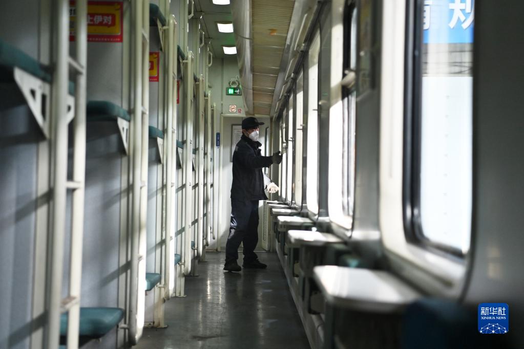 1月6日,在中国铁路太原局集团有限公司太原车辆段太原检修车间,工作人员在检修列车车窗。