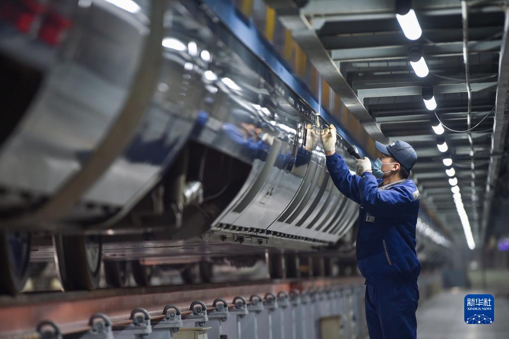 1月6日,在南京动车段南京南动车运用所检修库,地勤机械师在检修动车车体。