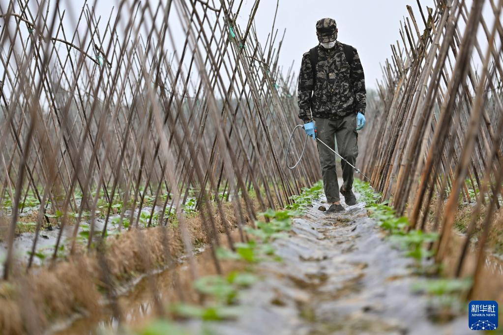 1月5日,在海南省澄迈县金安农场,农民为黄瓜苗喷洒农药。