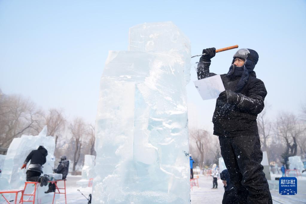 1月6日,在哈尔滨冰灯艺术游园会园区,冰雕师在进行冰雕作品创作。