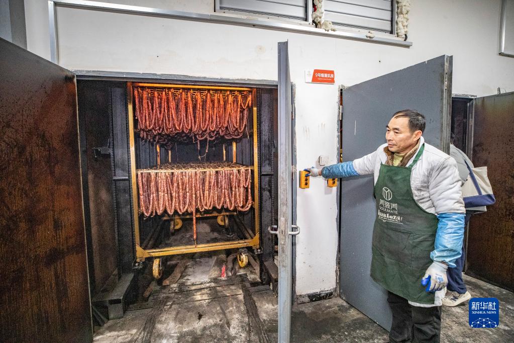 1月4日,在重庆市城口县坪坝镇新华村重庆美缀美食品有限公司,工人在智能化炕房车间利用升降机将需要熏制的香肠放进炕房。