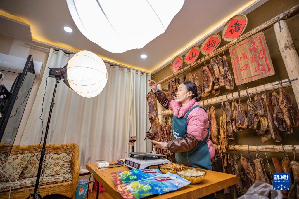 1月4日,在重庆市城口县巴山物语电商超市,主播向直播间的观众展示推销城口腊肉。