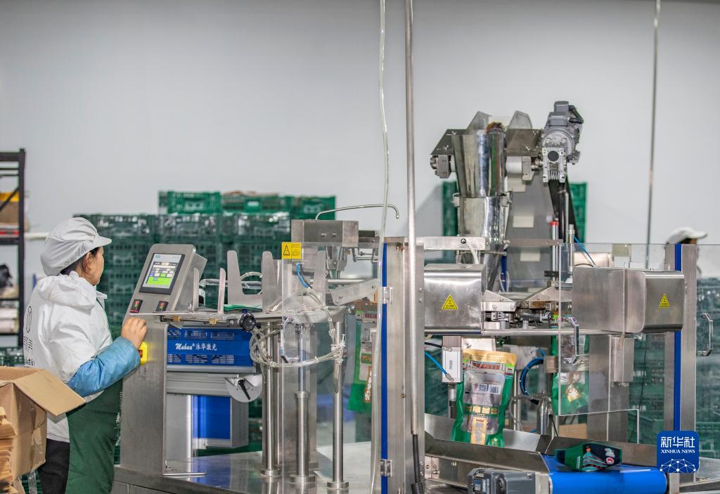 1月4日,在重庆市城口县坪坝镇新华村重庆美缀美食品有限公司,工人在操作自动打包机打包腊肉。