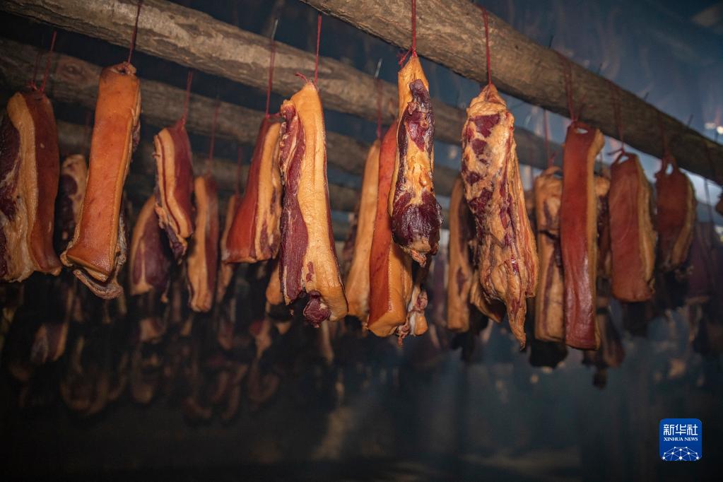 这是1月4日在在重庆市城口县厚坪乡红色村拍摄的村民黄由田家熏制的腊肉。