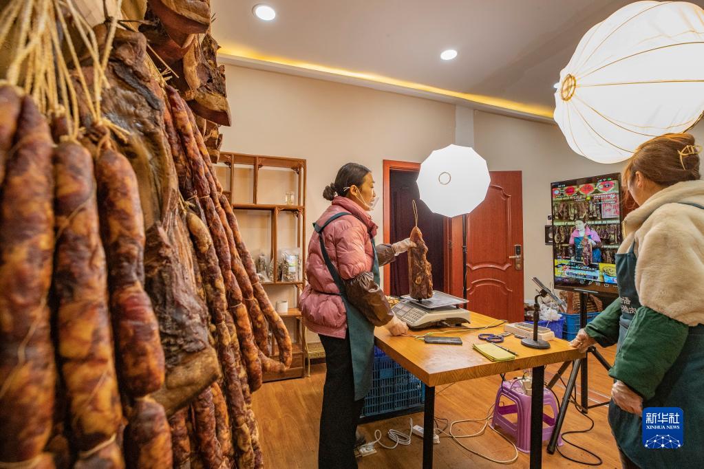 1月4日,在重庆市城口县巴山物语电商超市,主播向直播间的观众展示推销城口腊肉。