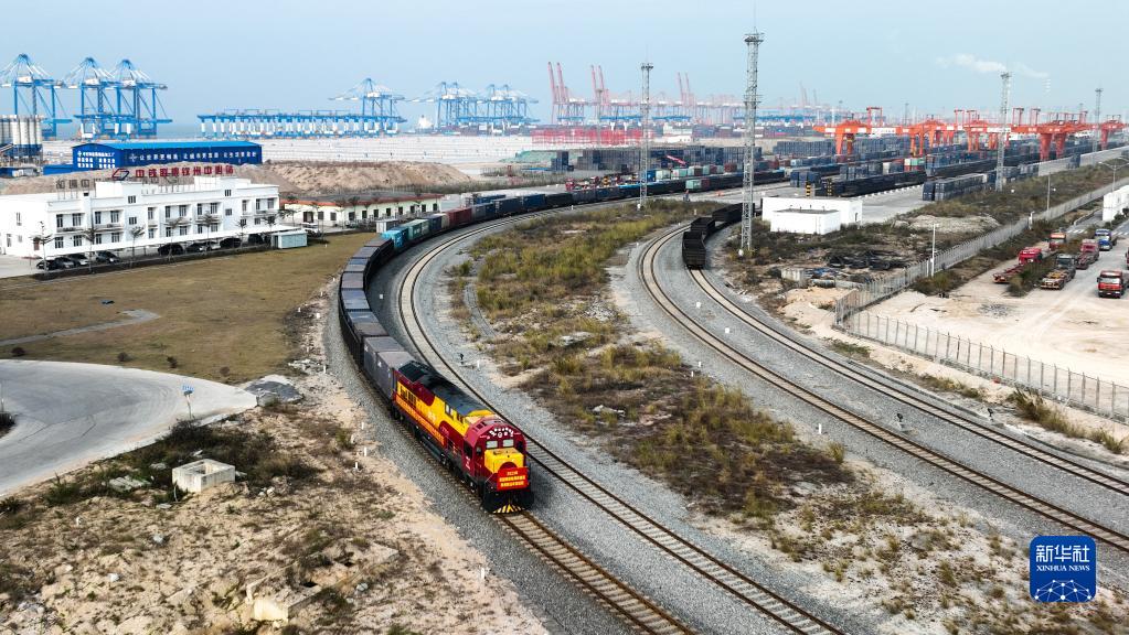当日,2023年首趟西部陆海新通道铁海联运年货班列从广西钦州港东站驶出,这列满载着东盟酥油、椰汁、玉米等食品的班列,预计2天后到达重庆,供应年货市场。