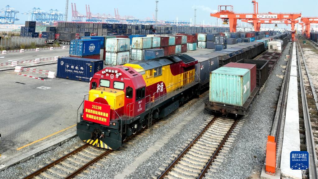 当日,2023年首趟西部陆海新通道铁海联运年货班列从广西钦州港东站驶出,这列满载着东盟酥油、椰汁、玉米等食品的班列,预计2天后到达重庆,供应年货市场。