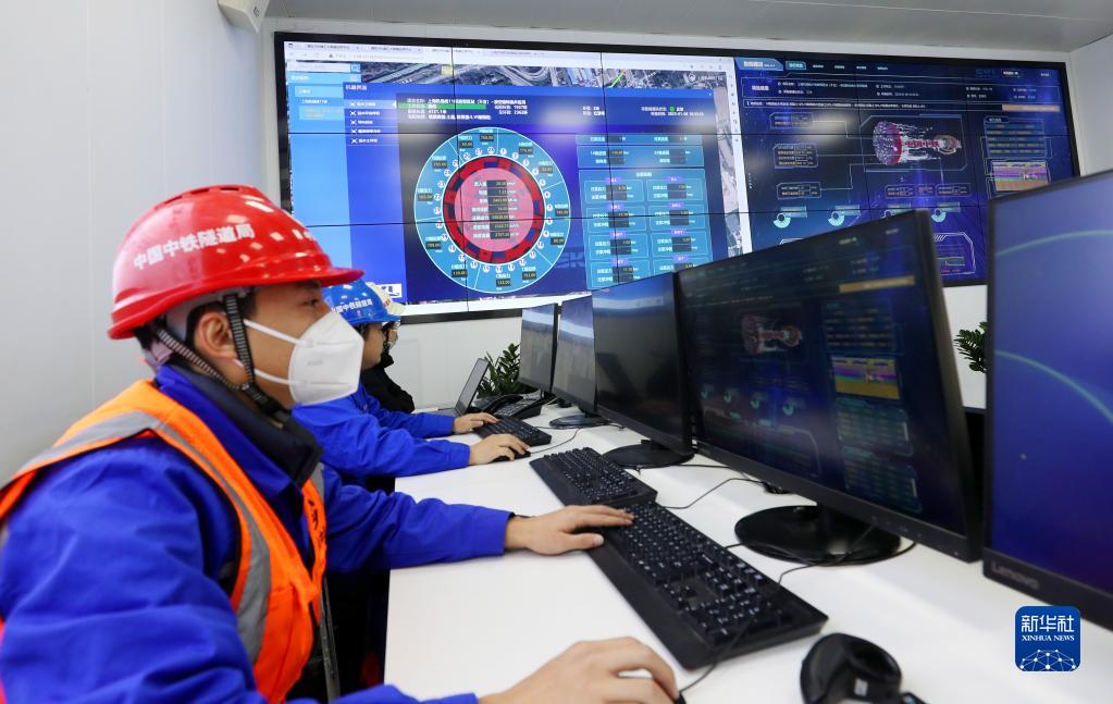 1月6日,在中铁隧道局上海市域铁路机场联络线11标项目施工现场,技术人员在盾构及掘进技术国家重点实验室大数据平台信息大屏前操作电脑。