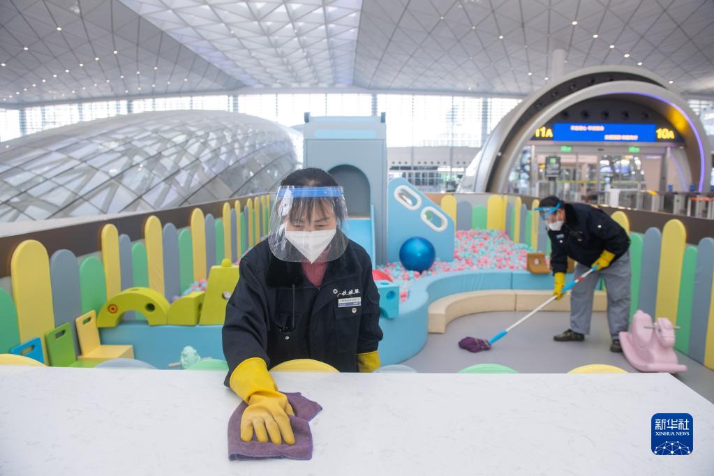 1月6日,杭州西站工作人员在清洁车站的儿童娱乐区。