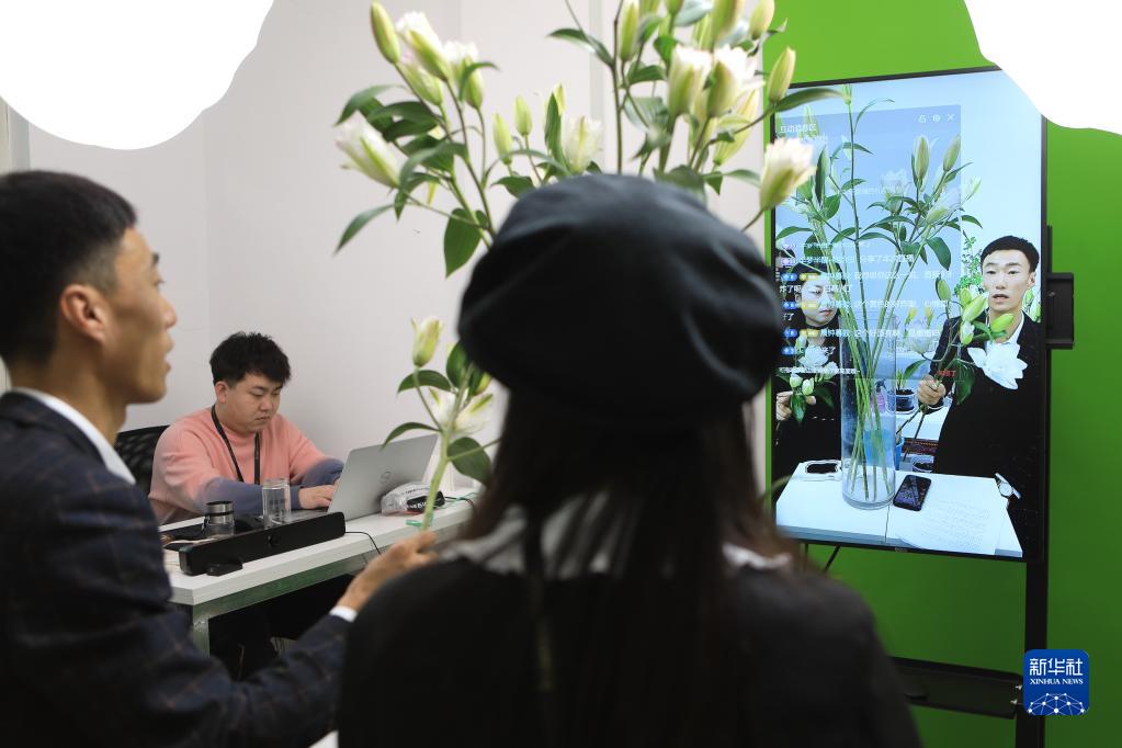 1月5日,在凌源市一家文化传媒公司,工作人员用网络直播的方式推介凌源百合。