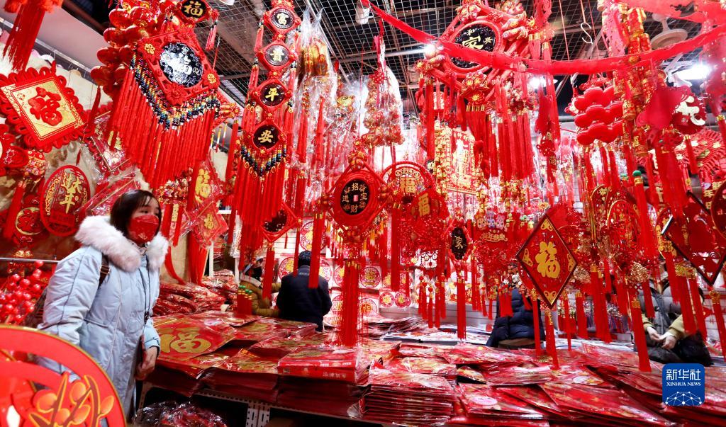 1月6日,市民在江苏省苏州市姑苏区一处年货市场内选购春节饰品。