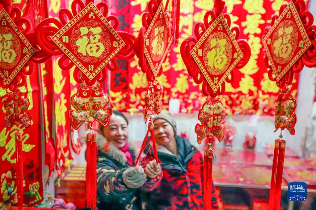 1月6日,市民在河北省玉田县鸦鸿桥镇一处市场选购新春挂件。