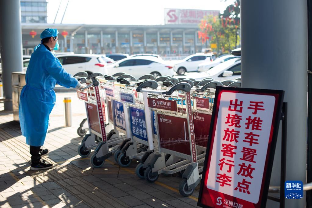 1月6日,在深圳湾口岸,工作人员在整理行李手推车。