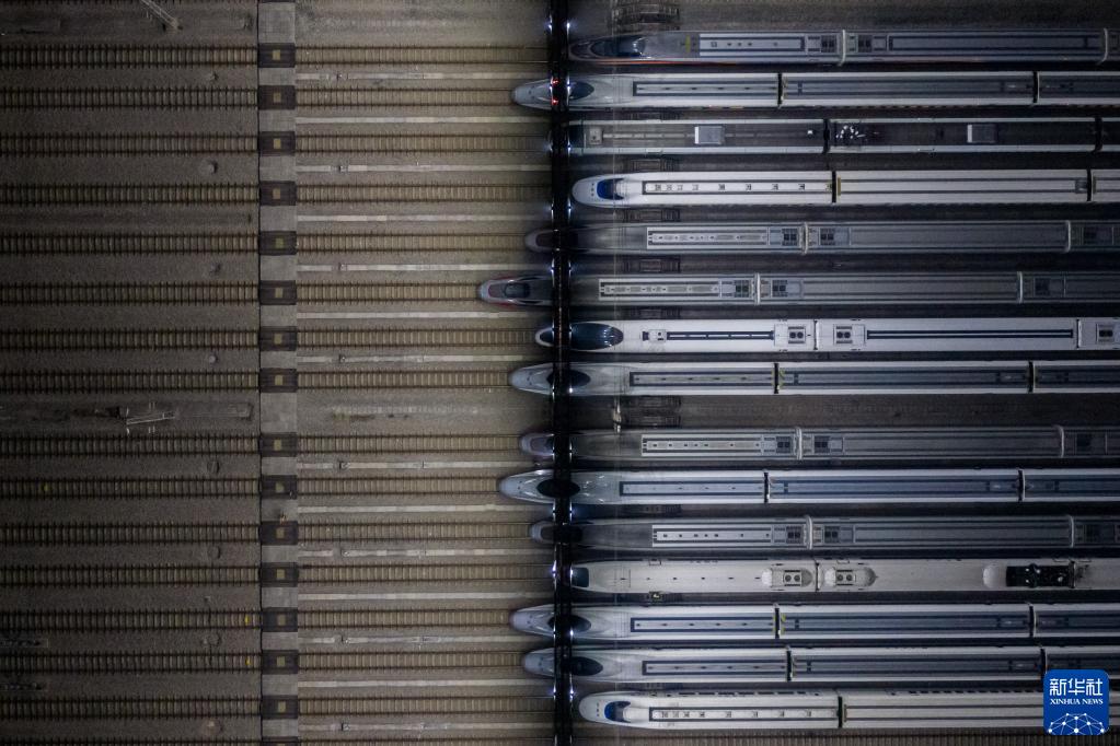 1月7日,2023年春运启动。在武汉动车段,工作人员通宵对近130组动车进行检修、保温作业,停靠在存车线上的动车排列整齐如同一支“陆地舰队”。