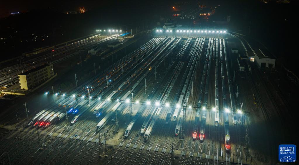 1月7日,2023年春运启动。当日凌晨,停靠在湖南长沙动车运用所的动车组列车排列整齐,如同一支“陆地舰队”。