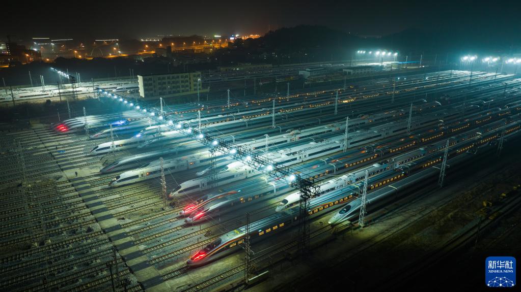 1月7日,2023年春运启动。当日凌晨,停靠在湖南长沙动车运用所的动车组列车排列整齐,如同一支“陆地舰队”。