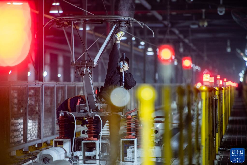 1月6日,地勤机械师在检修动车组列车的受电弓。