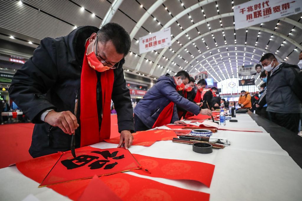 1月7日,书法家在沈阳站内为旅客书写福字、对联。