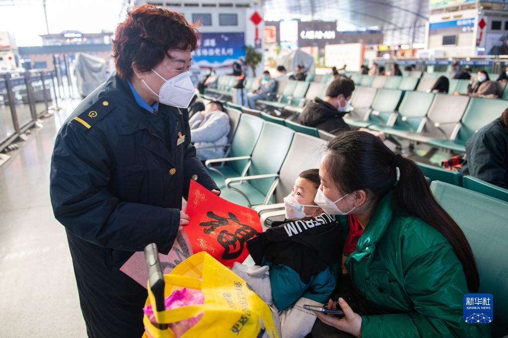 1月7日,在长沙南站候车室,工作人员给旅客送“福”字。