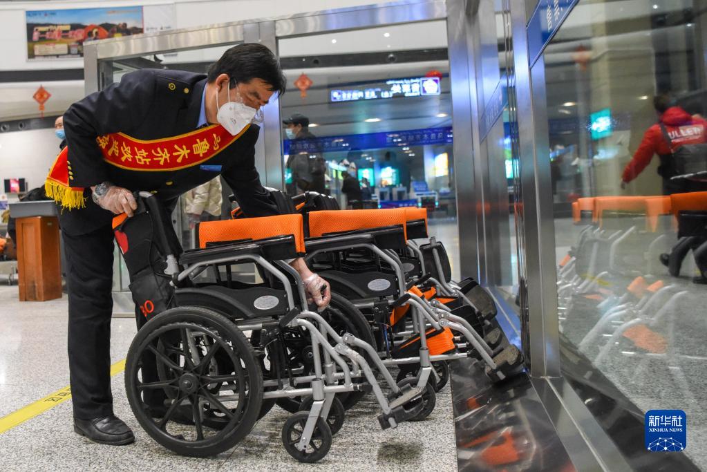 1月7日,在乌鲁木齐站候车大厅,工作人员在轮椅摆放区忙碌。