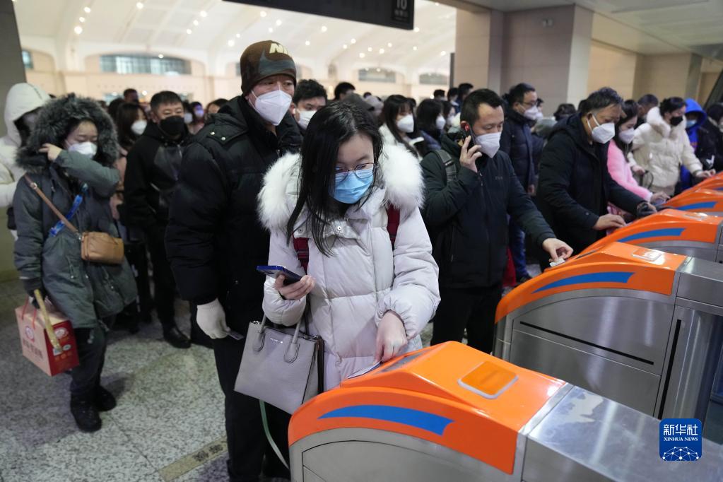 1月7日,在哈尔滨火车站,旅客检票进站。
