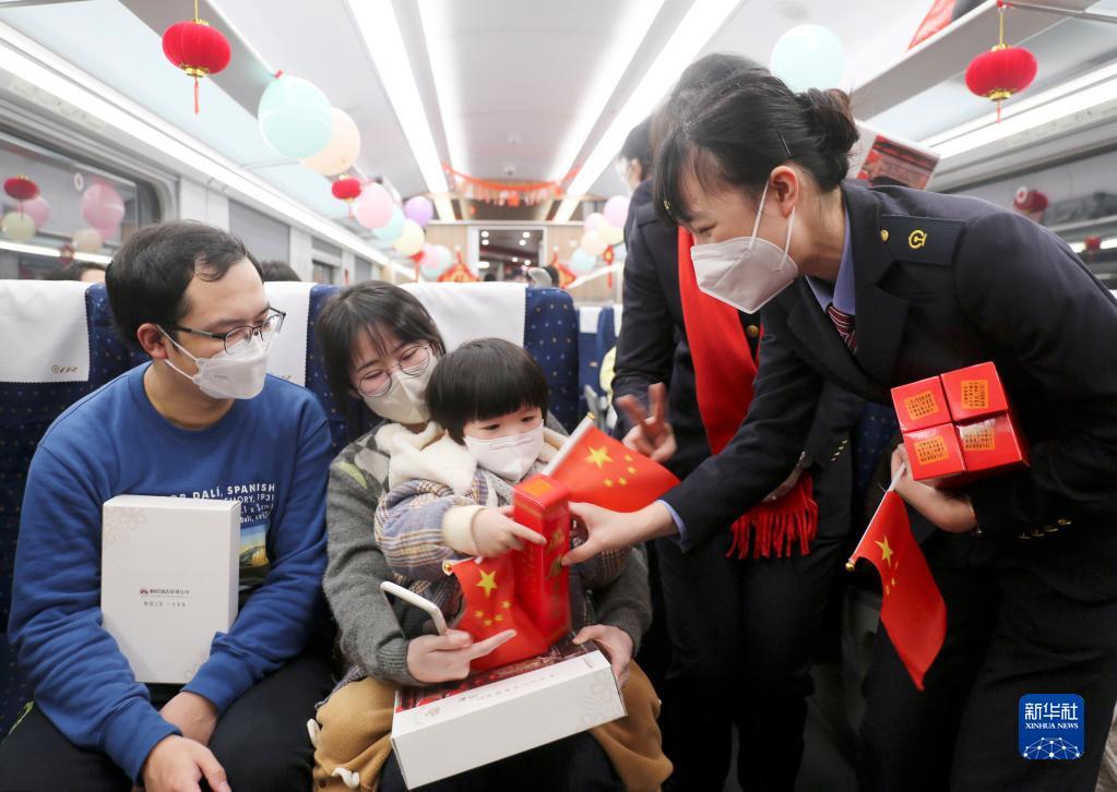 1月7日,乘务员在北京丰台开往福州的D759次列车车厢里为小朋友发放互动游戏奖品。