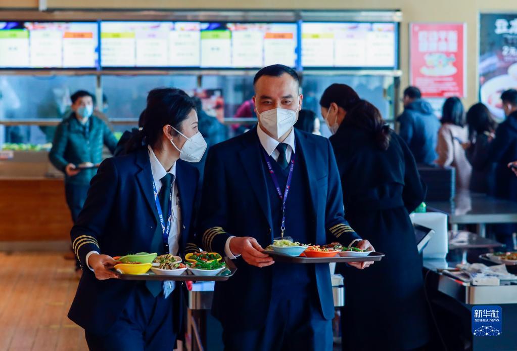 1月6日,重庆航空的食堂内,出任务的杨静(左)和丈夫菅士博(右)边打饭边交流。