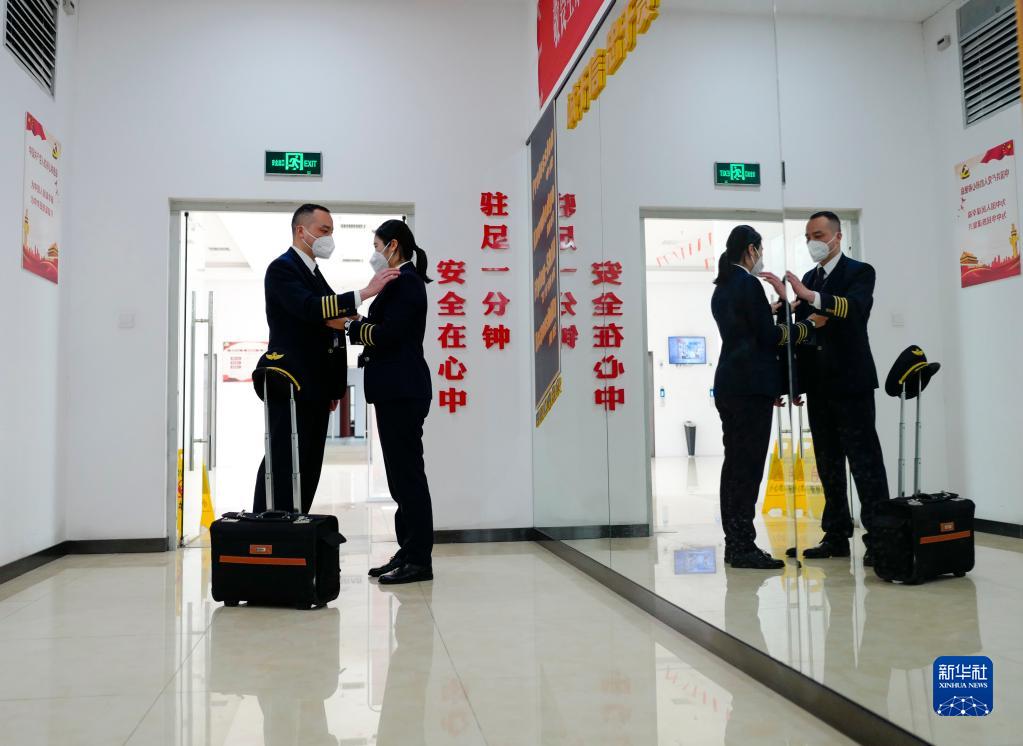 1月6日,重庆航空的机组工作区内,先出发的菅士博(左)在向妻子杨静(右)告别。