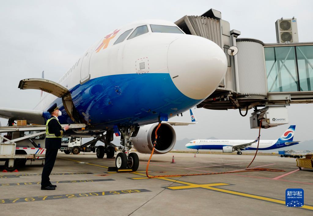 1月6日,重庆江北国际机场的停机坪上,机长菅士博对客机进行起飞前的绕机检查。