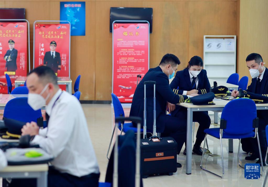 1月6日,重庆航空的机组工作区内,杨静(右二)和丈夫菅士博(左一)在不同机组进行飞行前的准备。