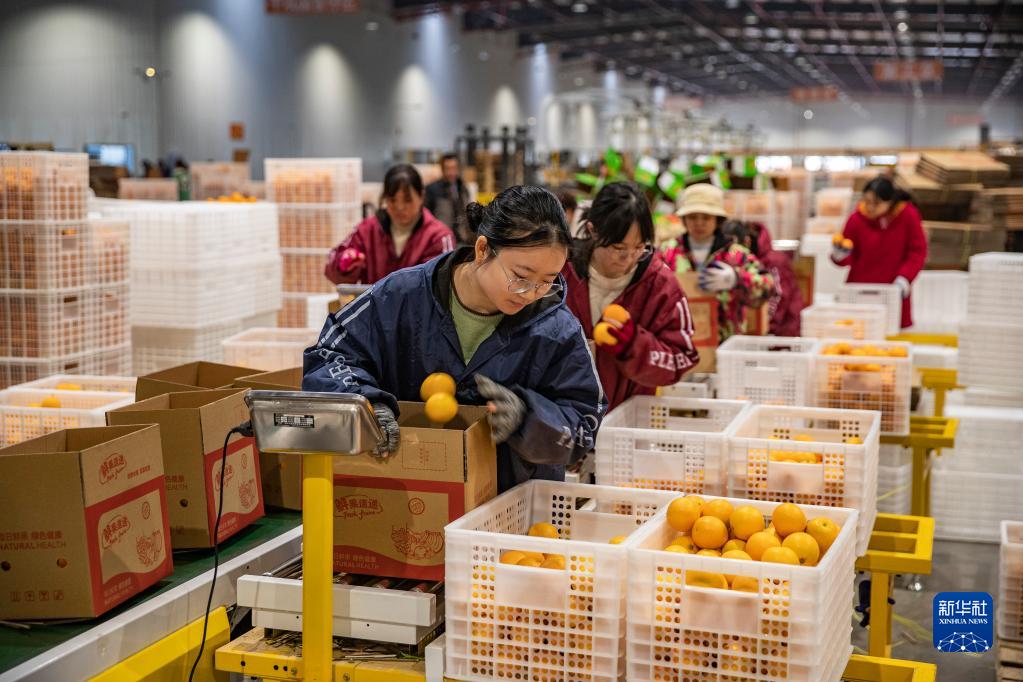 1月6日,在中国三峡柑橘(奉节脐橙)交易中心,工作人员对即将发货的脐橙装箱称重。