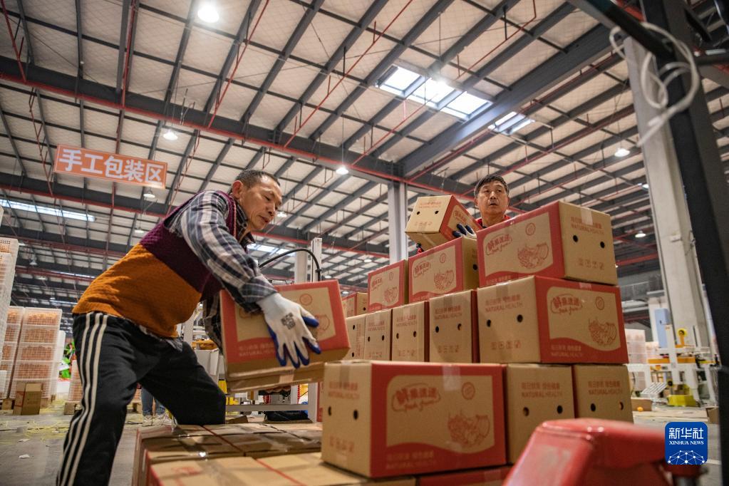 1月6日,在中国三峡柑橘(奉节脐橙)交易中心,工人搬运即将发货的脐橙。
